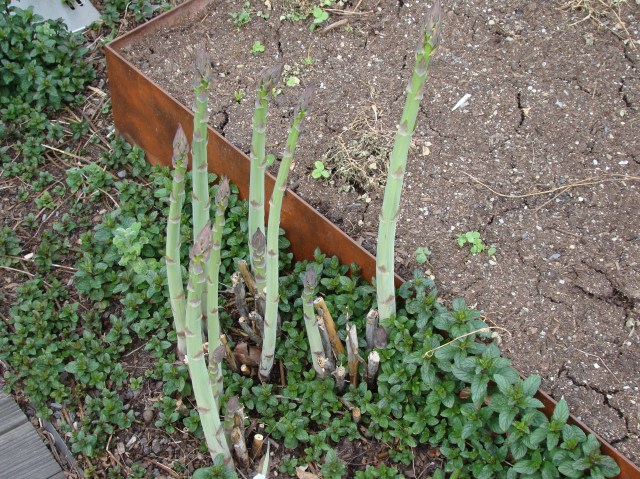 Four years have passed since we interred the crusty brown asparagus crowns in the shallow soils to the west of one of the deeper vegetable beds, with hope, of course, but also the nagging realization that this was one of our roof top experiments most likely to fail. All the authorities counseled that beautifully prepared deep loamy soils were critical for success, and in the vast reaches of the World Wide Web I could find no evidence that anyone else had successfully harvested asparagus from a green roof. And now, four years later: