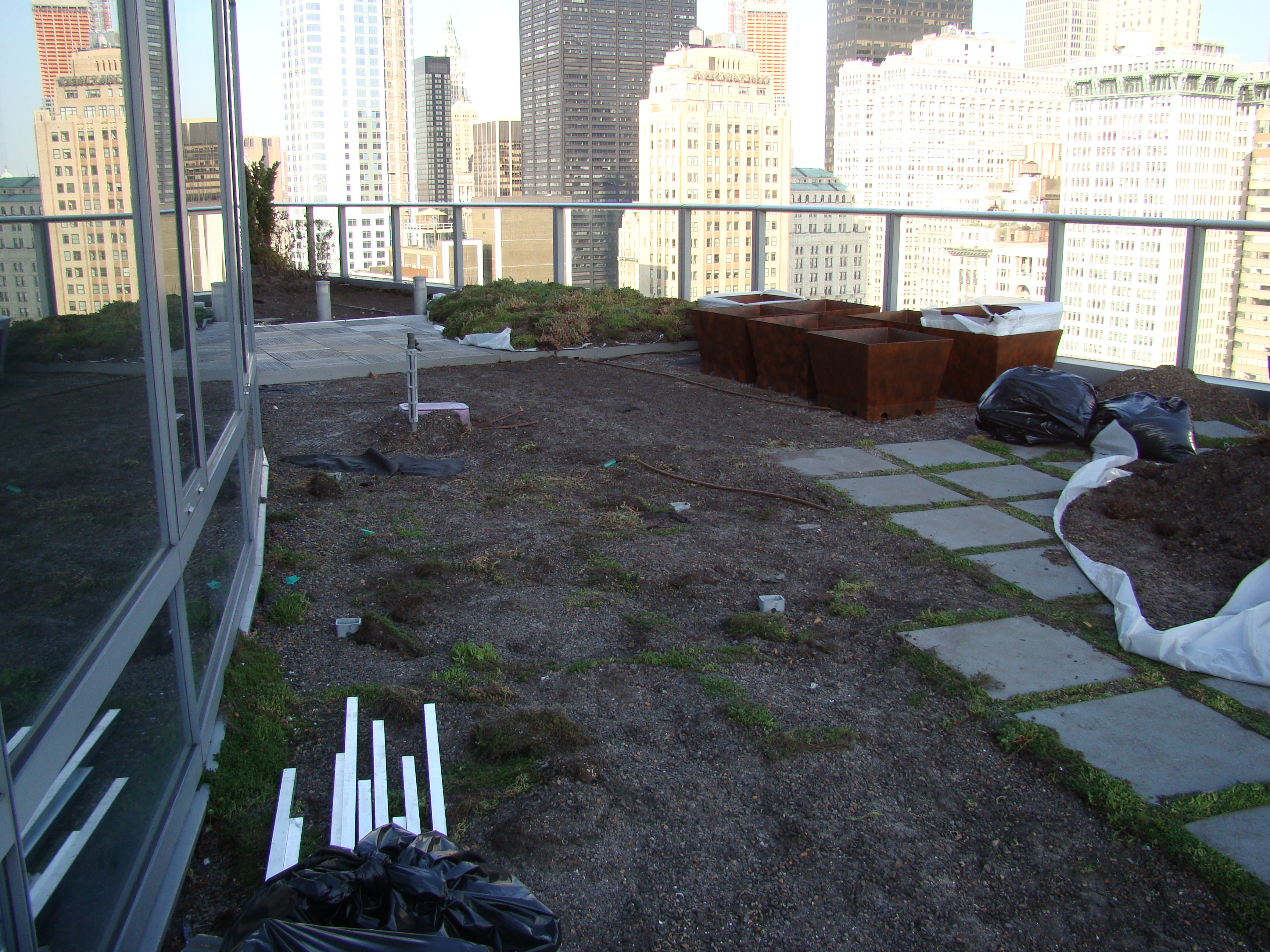The roofing membranes, water-collection/drainage matt and root barriers were already installed on the pre-existing extenstive green roof, and were not changed: