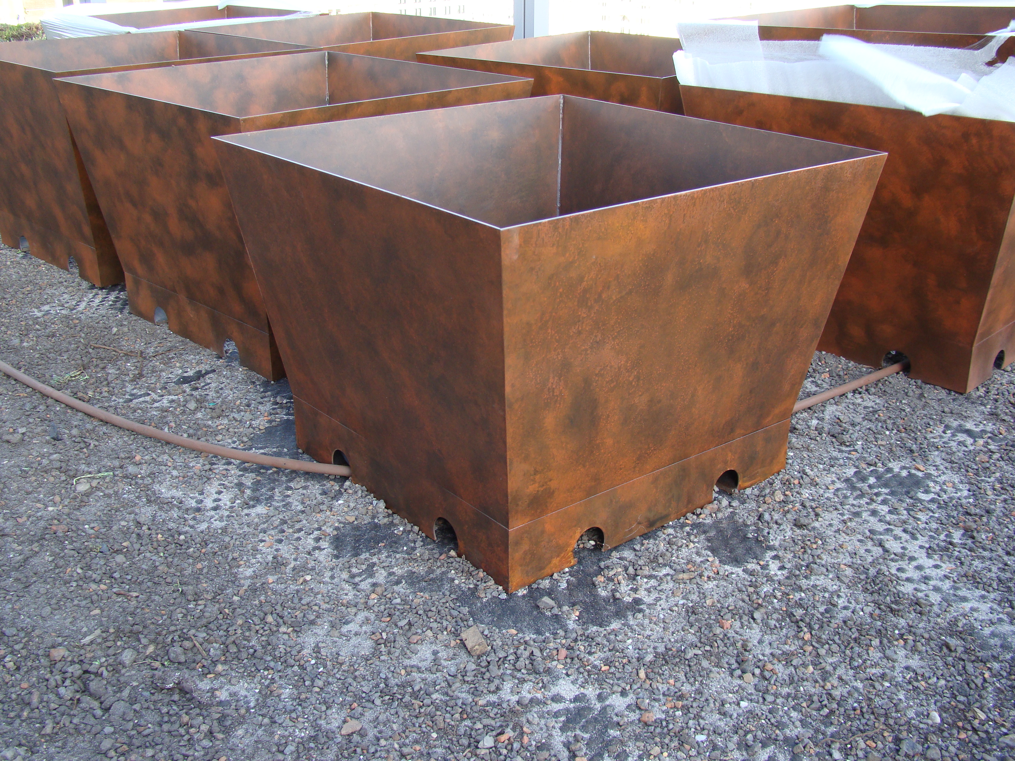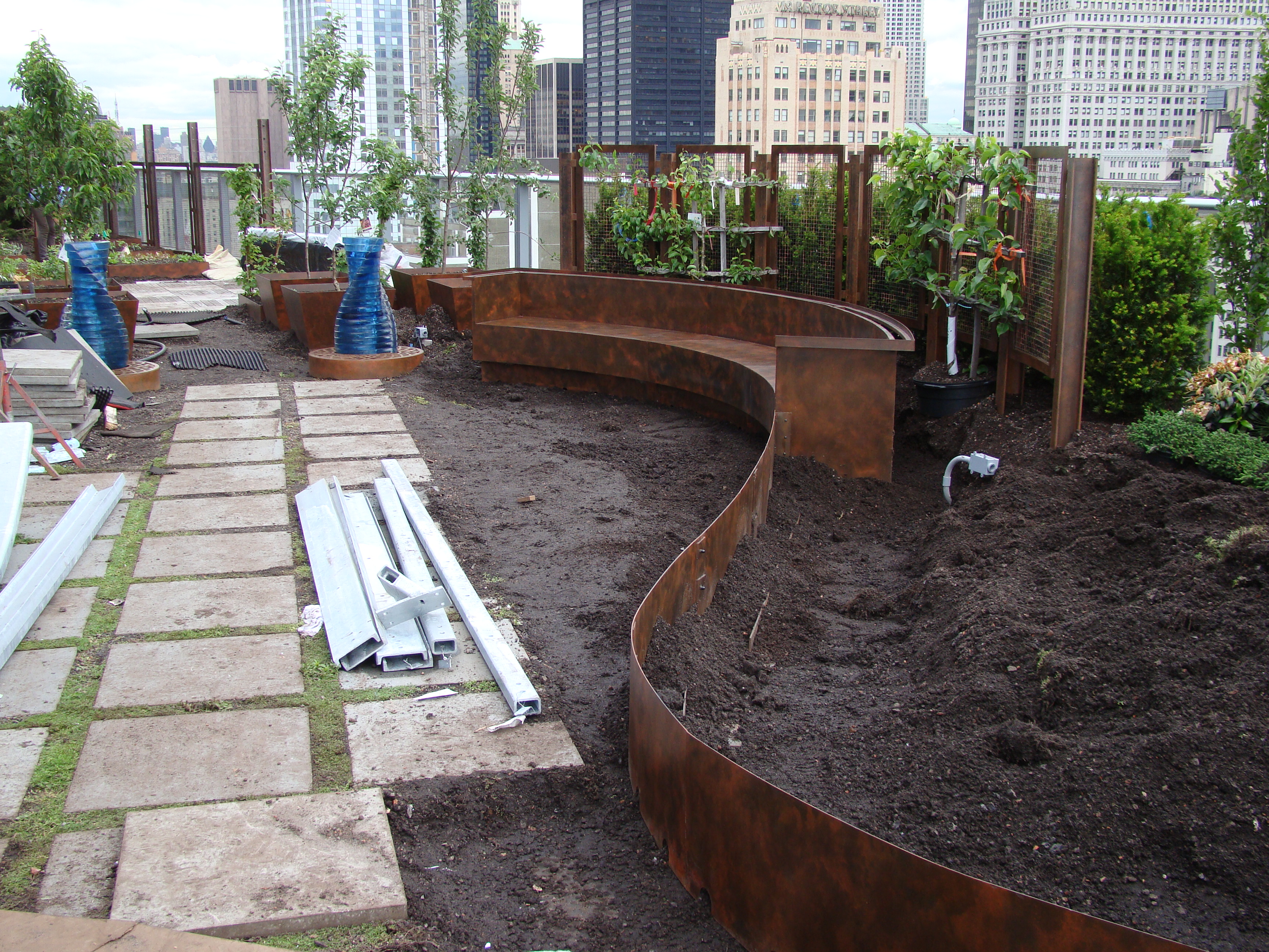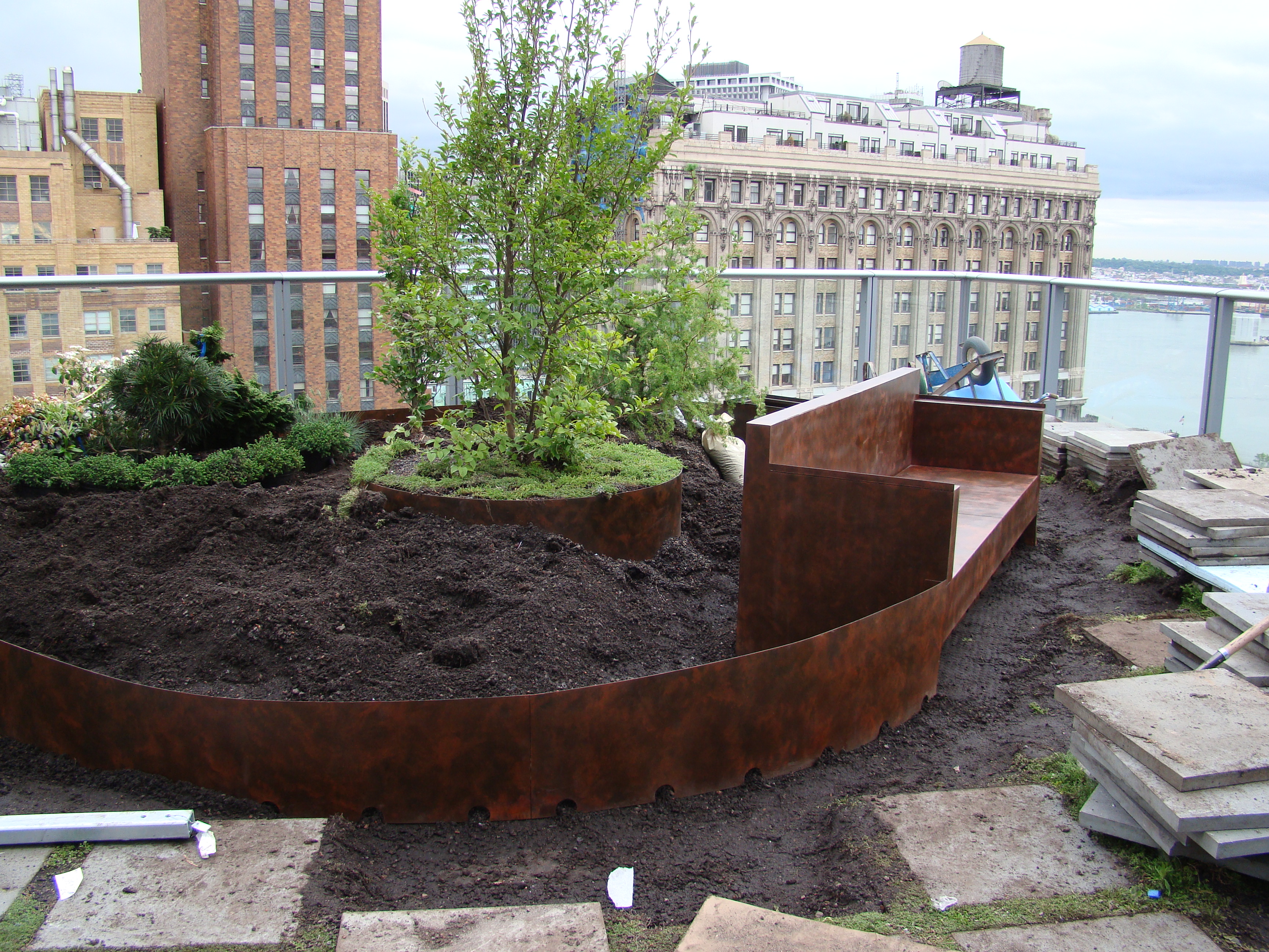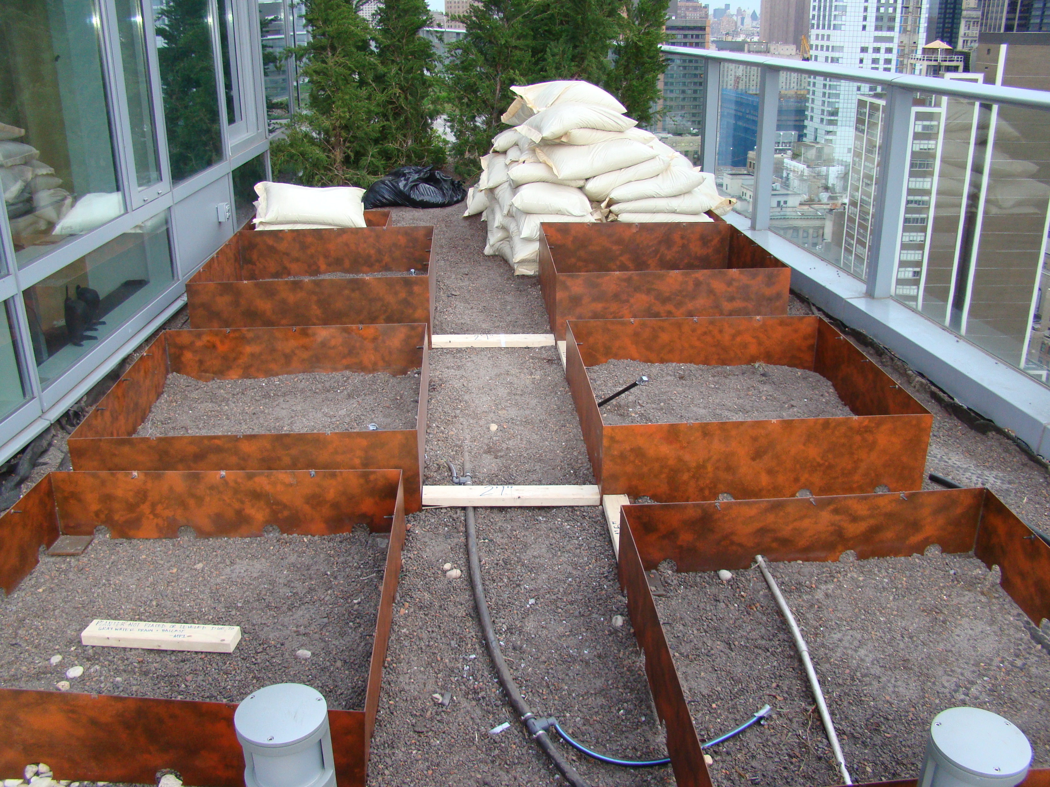 Below are the open-bottom planters for fruit trees. On a green roof, all planters have open bottoms, to freely allow roots to penetrate the ground below the planter, and to allow water to freely flow: