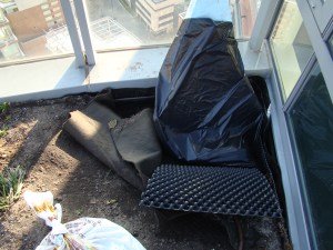 Construction of the green roof commenced in early March and was largely complete by late-May. See “The Team” page for names of the designers and contractors involved. Here, in chronological order, are some photographs of construction progress:
