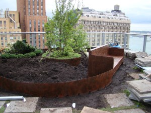 The east berm, as installed on May 19, 2010, with the taller cylinder for the Stewartia, and the support for the espalier: