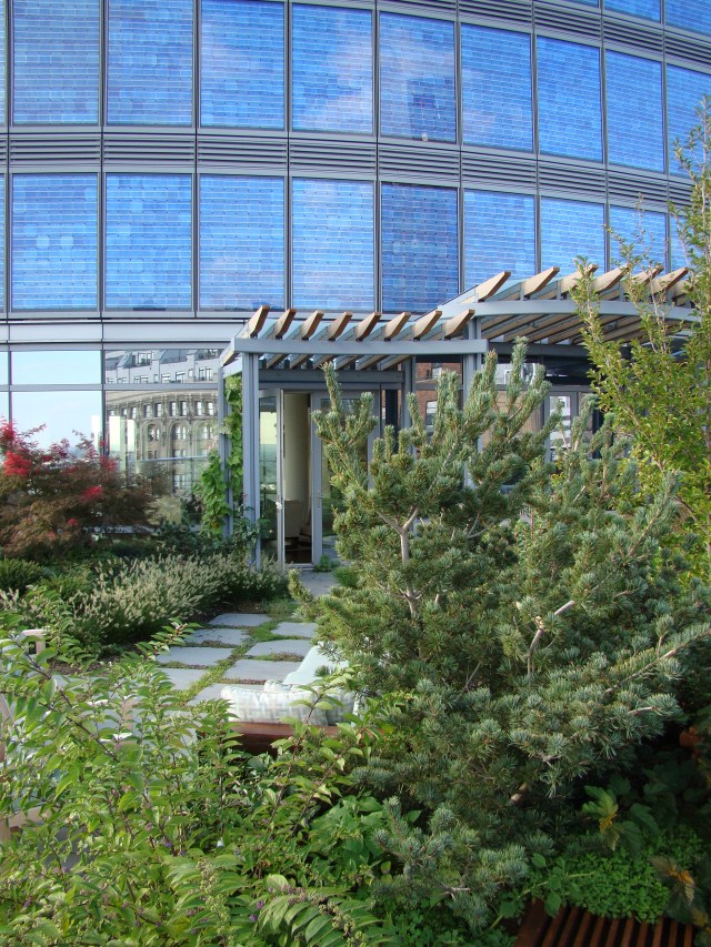 The Battery Roof-top Garden is greatly enhanced, aesthetically as well as environmentally, by the adjacent penthouse tower of The Visionaire condominium (LEED “Platinum”), the east and west facades of which are lined with cobalt blue photovoltaic solar panels. The “Double Helix” fountains designed by Eve Vaterlaus have been designed to pick up the wonderful blue glass backdrop which serves as the West wall of the garden: