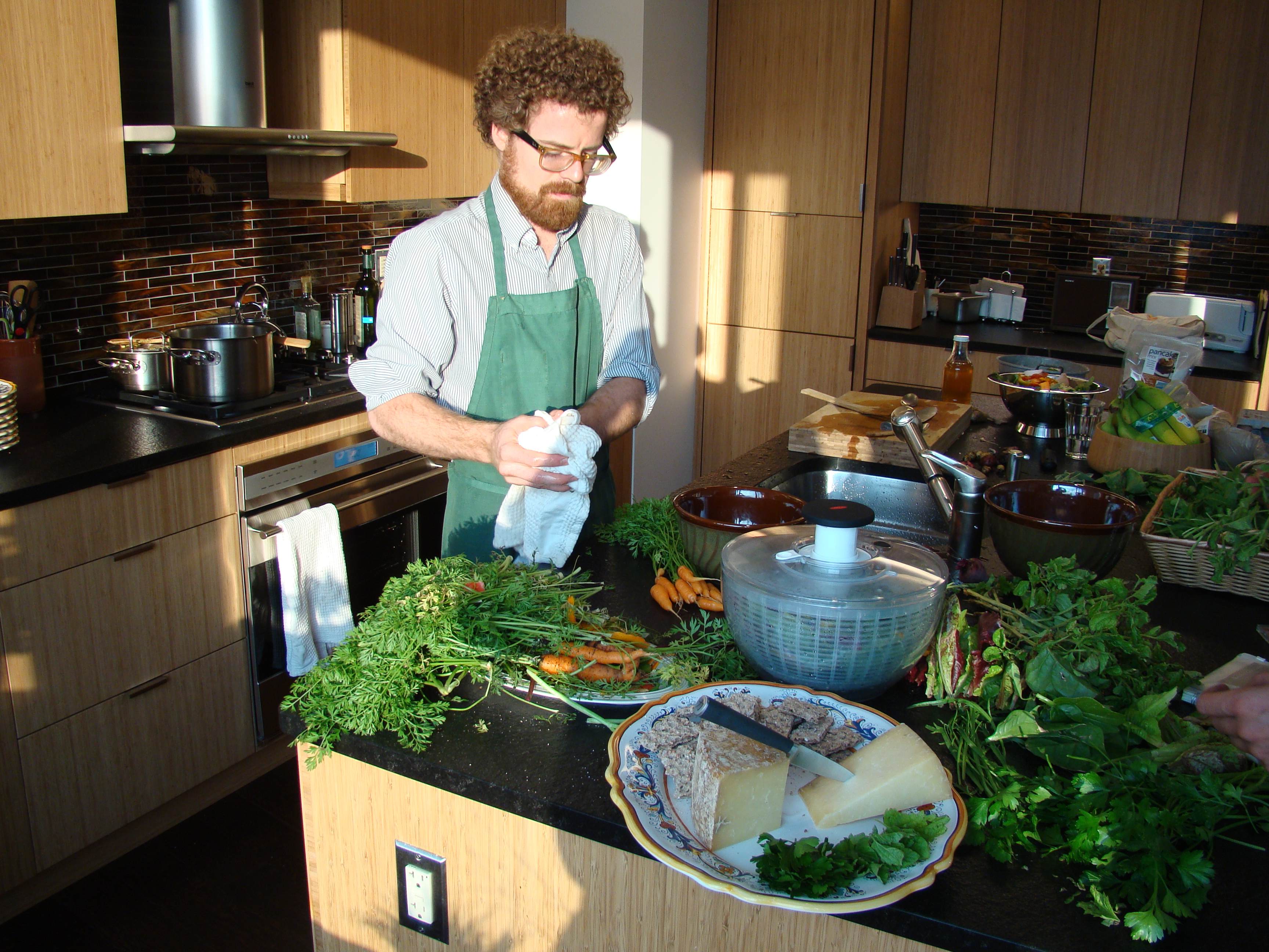 - First course was a hot carrot soup, with freshly harvested sweet carrots from the roof, thickened with squash from Eagle Street farm rooftop, and seasoned with herbs from the roof.