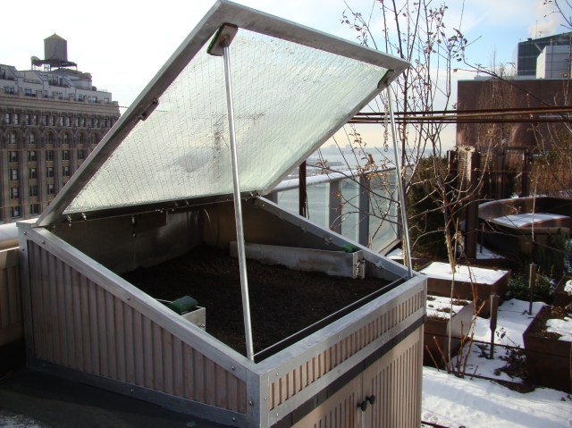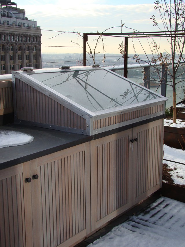 The cold frame arrived on December 20. It is a thing of beauty, although a far cry from the traditional country cold frame, which usually consists of an old window propped up against a south wall, and a rough wooden box set directly on the soil. This one, designed and engineered by Mark Morrison and his team at Windsway (see “The Team” link above), is built from heavy aluminum framing, safety glass and hinges reminiscent of the bulk-head of a nuclear submarine. A heating pad using very little power gives a margin of safety against freezing on the coldest winter nights. Such are the demands of farming on the 35th floor, where conditions are harsh, and everything must be designed to anticipate the consequences of a Force 5 hurricane or tornado sweeping through New York harbor.