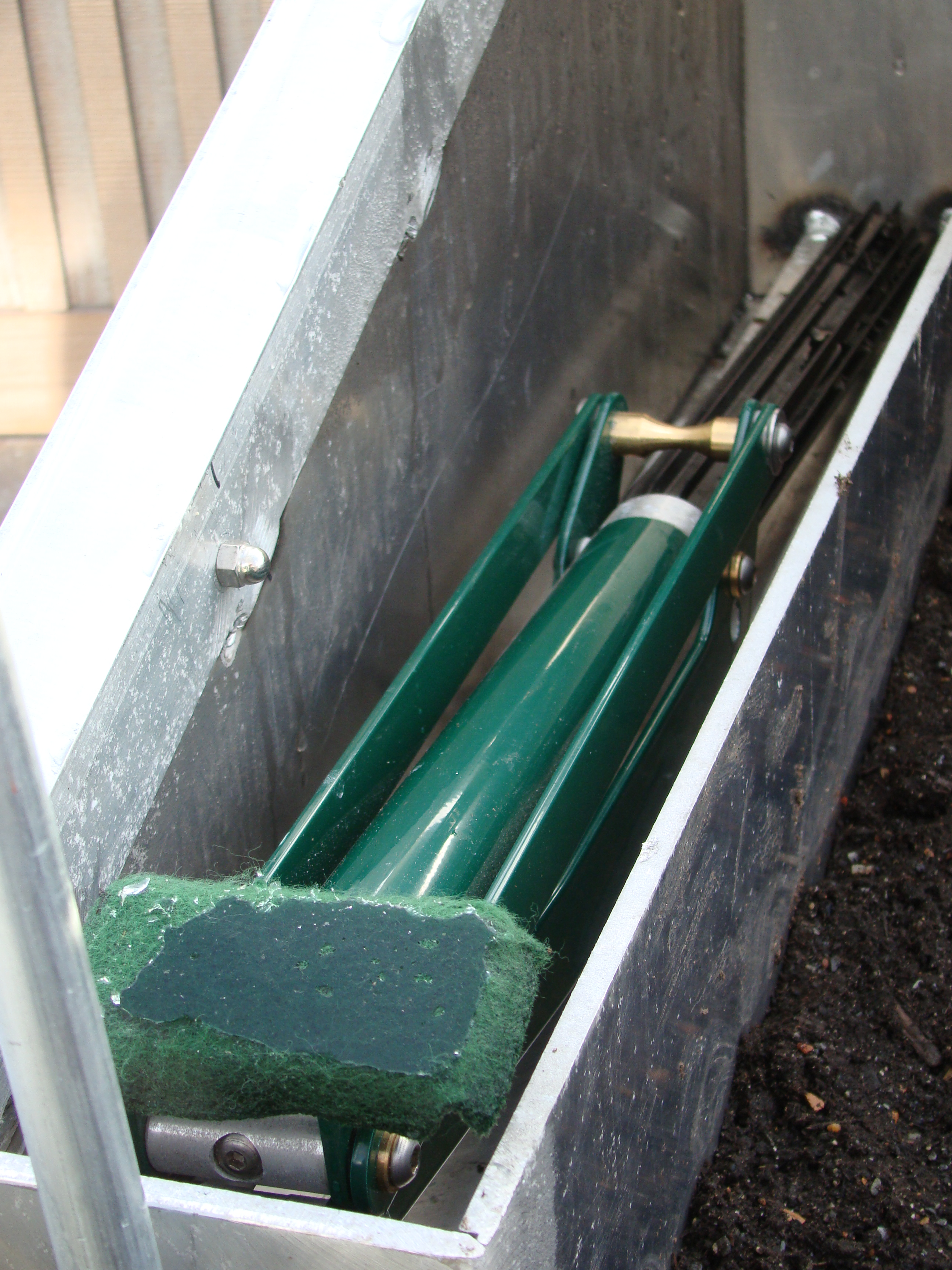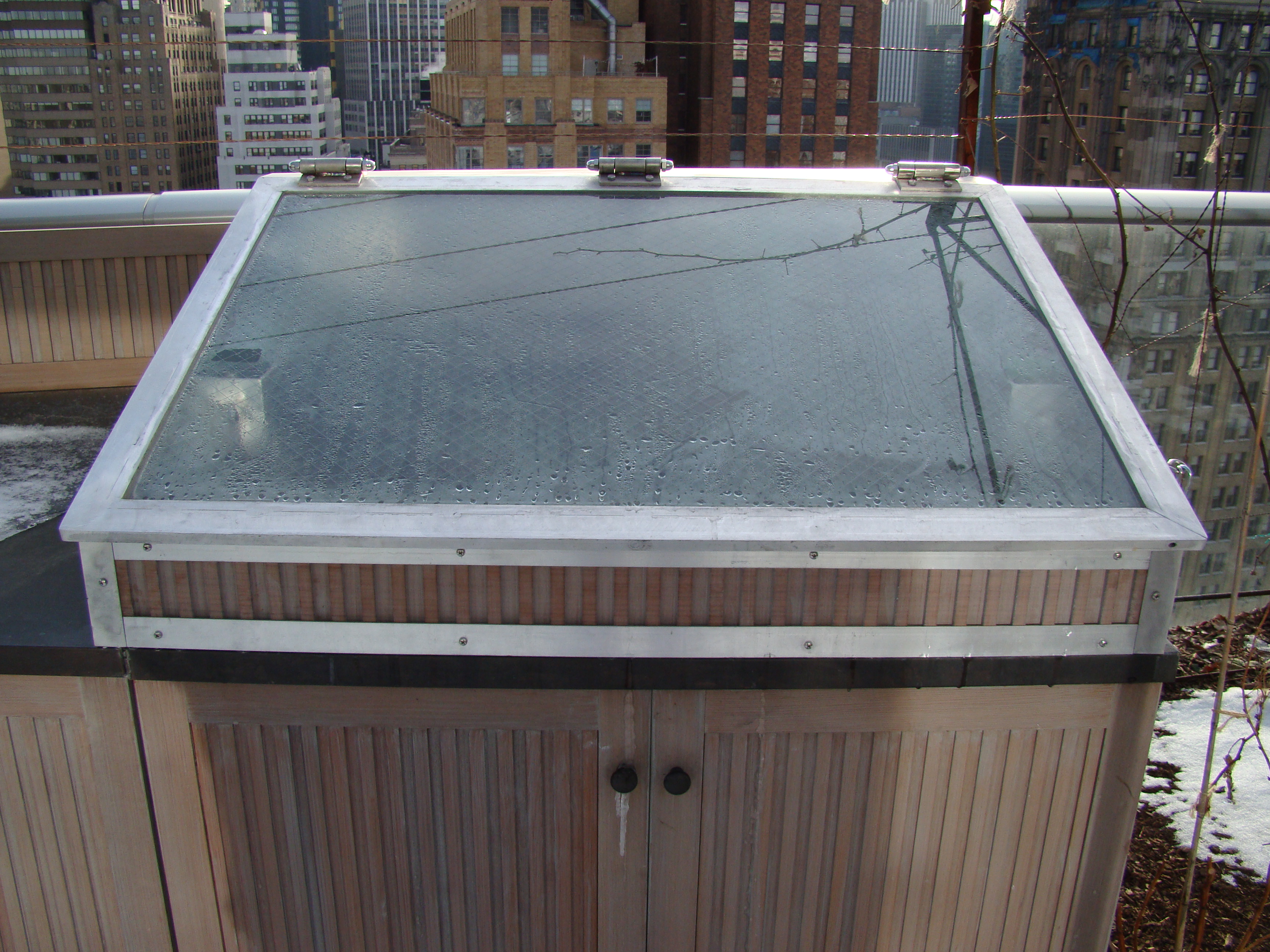 The key challenge with a traditional cold frame is to be present to prop open the lid on a sunny winter day. Even on the coldest day, the “greenhouse effect” results in temperatures high enough to damage or kill the plants growing inside. Since the Battery Rooftop Gardener is not present to perform this task, the cold frame has been designed with automatic pistons, which sense the interior temperature and then automatically lift the heavy lid to allow ventilation. As you can can see from the photograph below, this is a major piece of engineering: