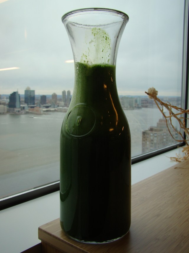 morning’s fresh batch of kale juice (rendered slightly more congenial by the addition of some sorrel and apple).
