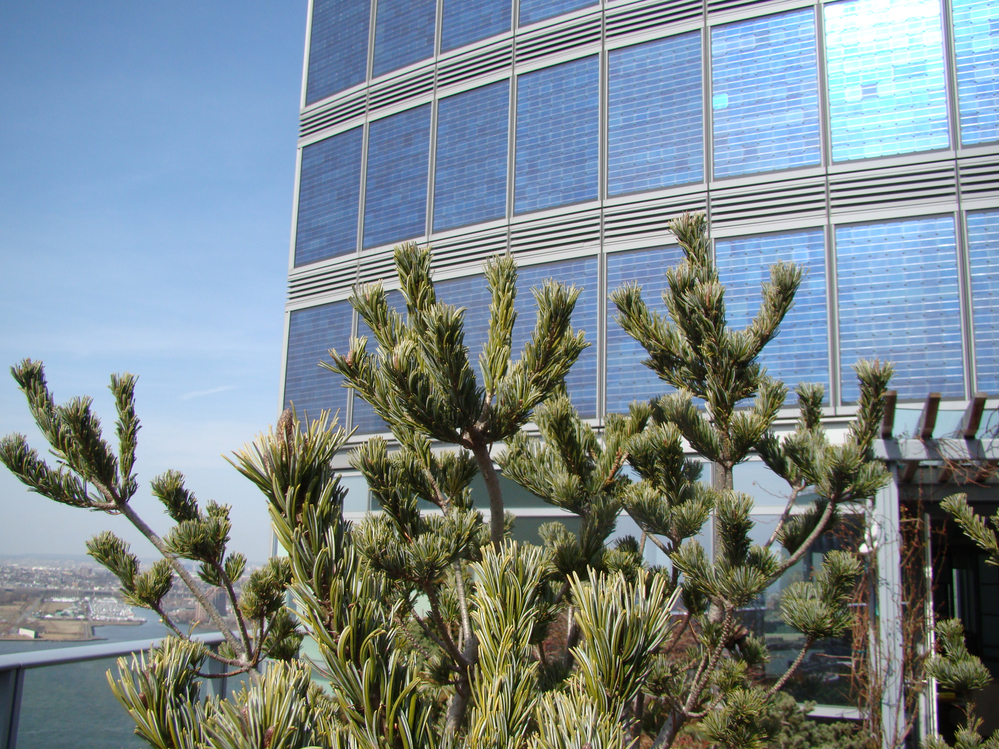 But what of taking plants out of nature? Most of our urban parks are about creating the illusion of the country in the city. Most park designers attempt to create ecological niches that mimic those in rural settings. But rooftop gardeners have no such luxury. Here on the 35th floor, there is no acidic oak forest, no marshy edge to a vernal pool, no woodland edge. Instead, we have a uniform soil mix, perfectly drained, surrounded by glass and steel parapets and curtain walls, the concrete and brick towers of Lower Manhattan, and the 17,000 acres of New York Harbor.