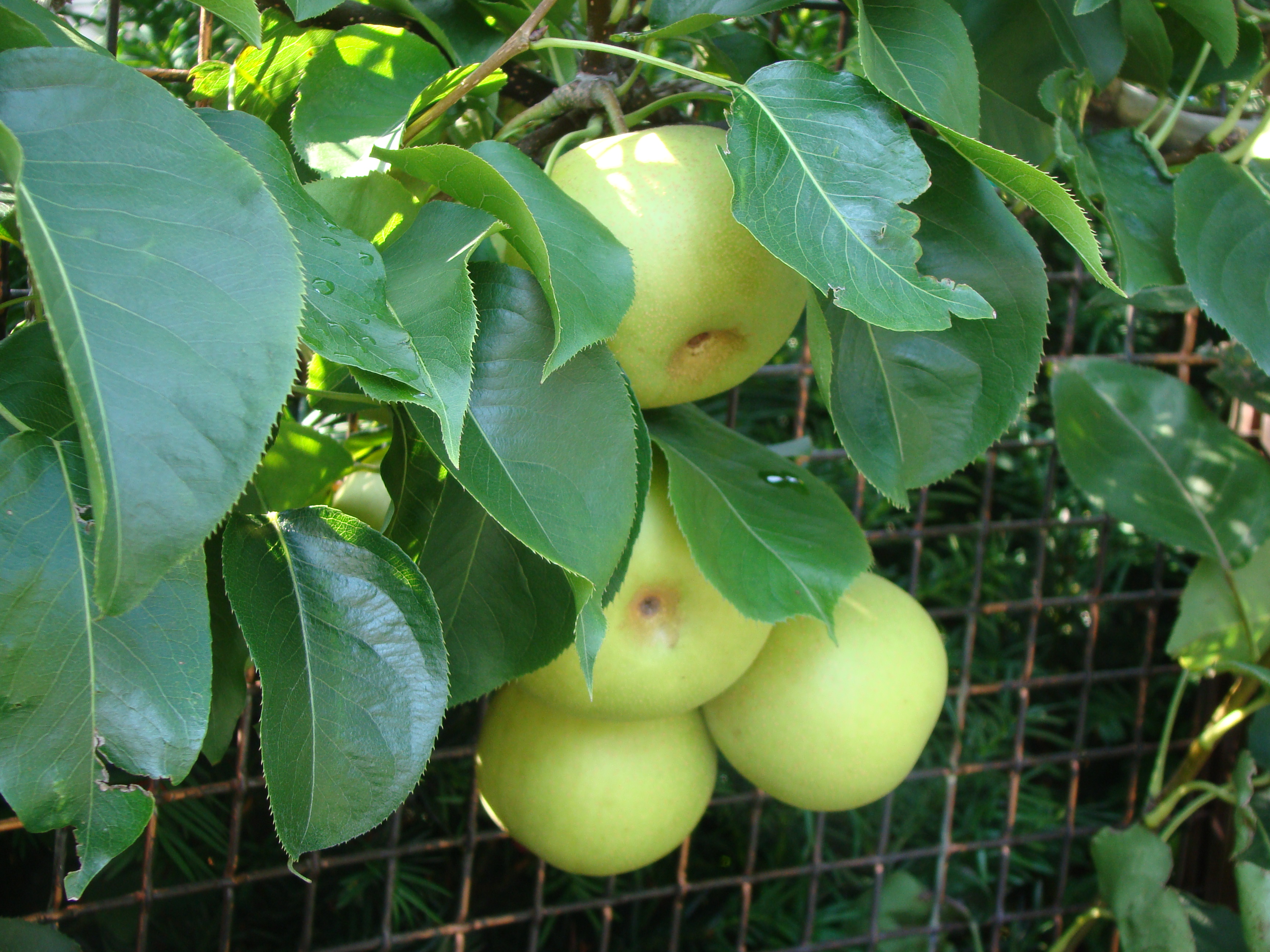 In addition to size, an espalier will allow you to mix multiple cultivars of Pyrus pyrifolia on the same plant.  At BRTG, three cultivars of Asian pear are grafted on to the same standard:  ‘Chojuro’, meaning “plentiful,” one of the oldest (cultivated in Japan in 1893); the more familiar ‘Nijisseiki,” which means “20th Century” and dates from 1898; and ‘Shinseiki,’ meaning “new century,” perhaps the most familiar to North American orchardists, known for its pale fellow skin and reliable production of fruit in late August.